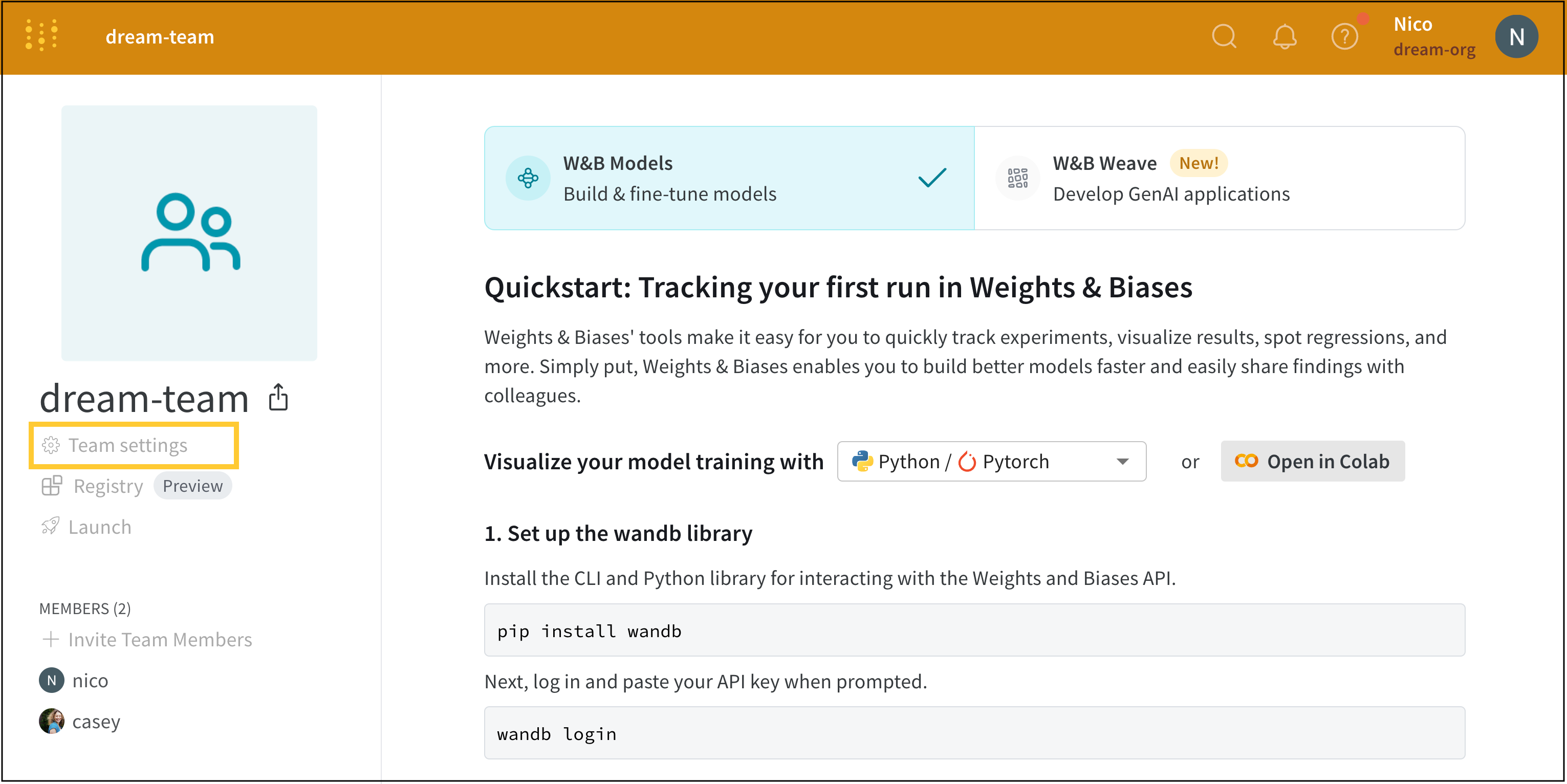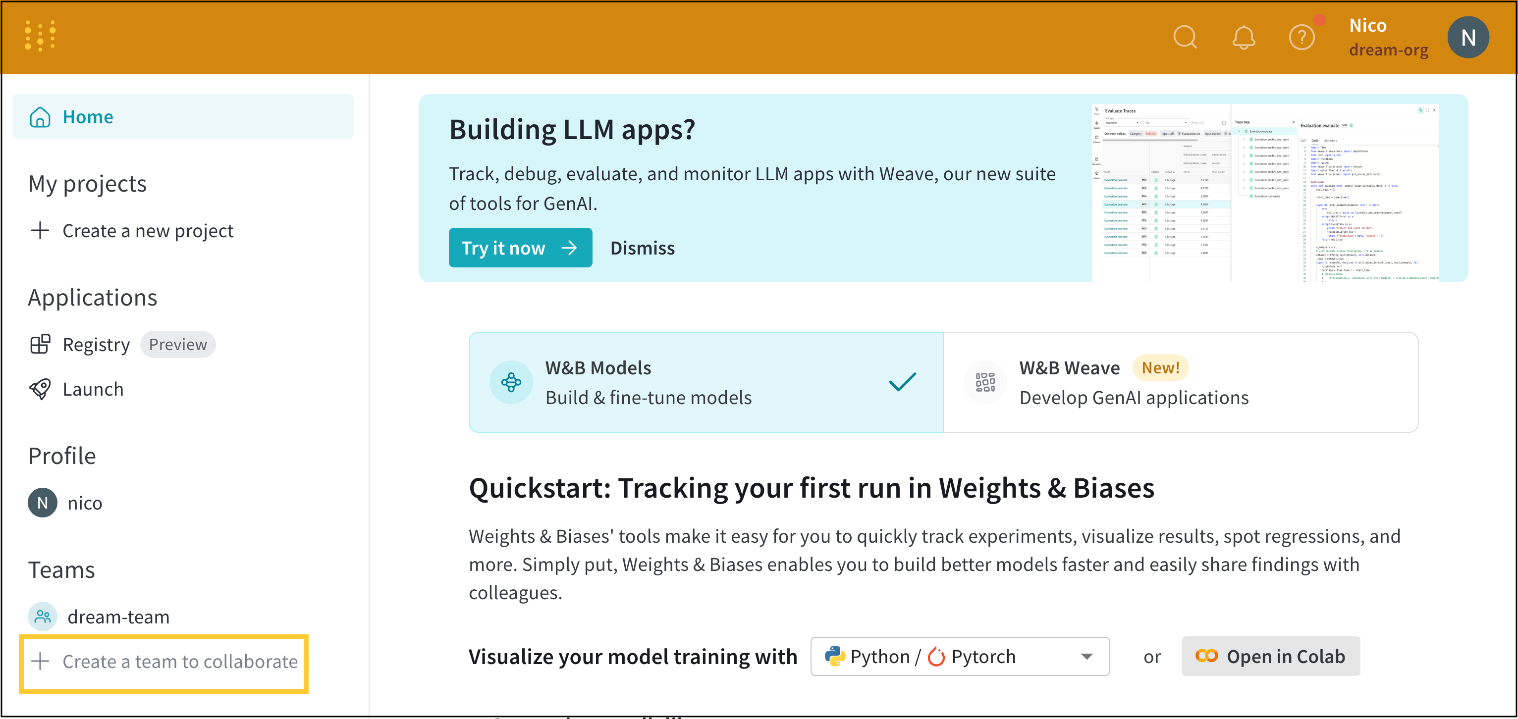 組織のダッシュボードを使用してチームを作成します:- https://wandb.ai/home に移動します。