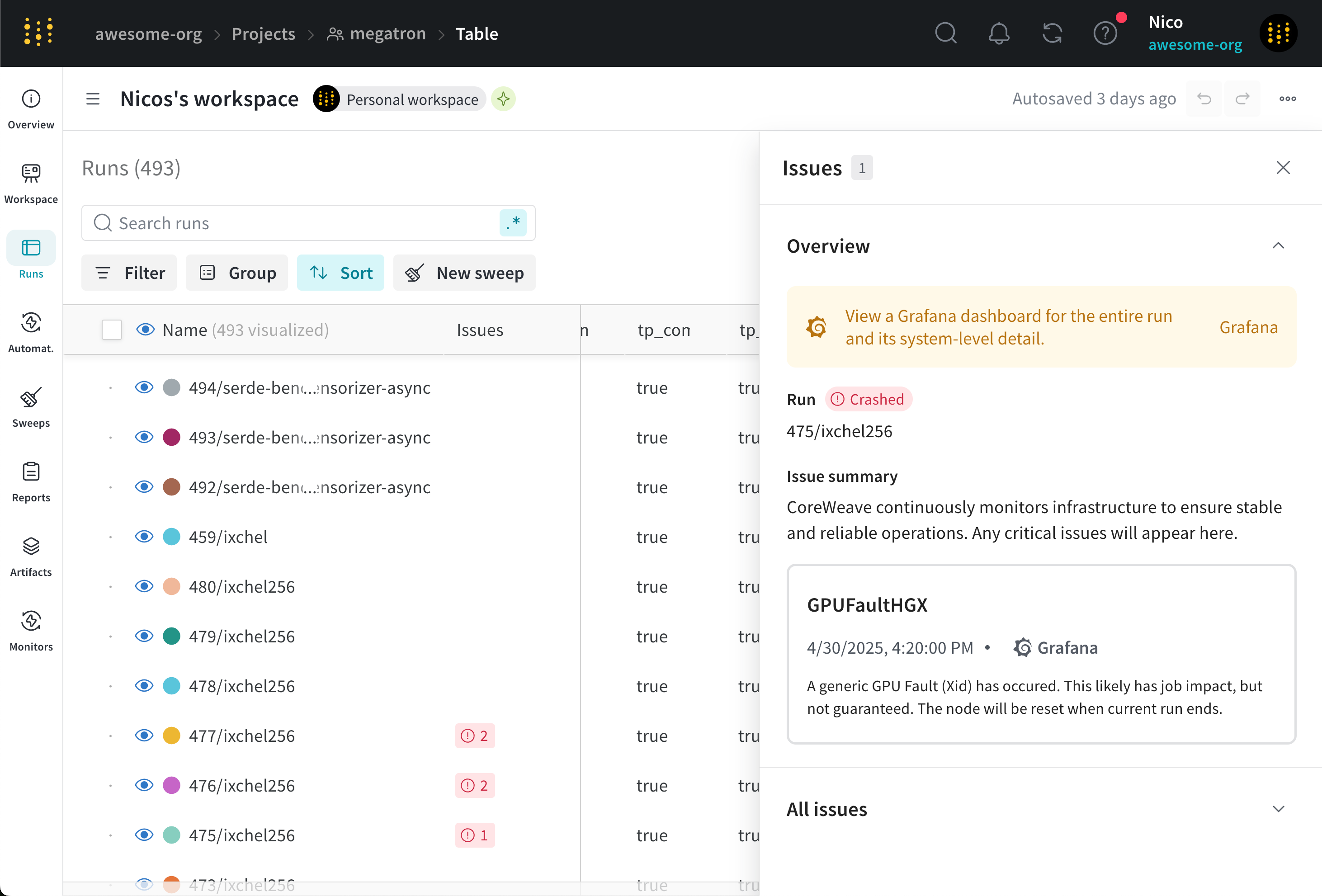 - Search and select the name of the run that contains an infrastructure issue. If CoreWeave detected an infrastructure issue, one or more red vertical lines with an exclamation mark overlay the run’s plots.